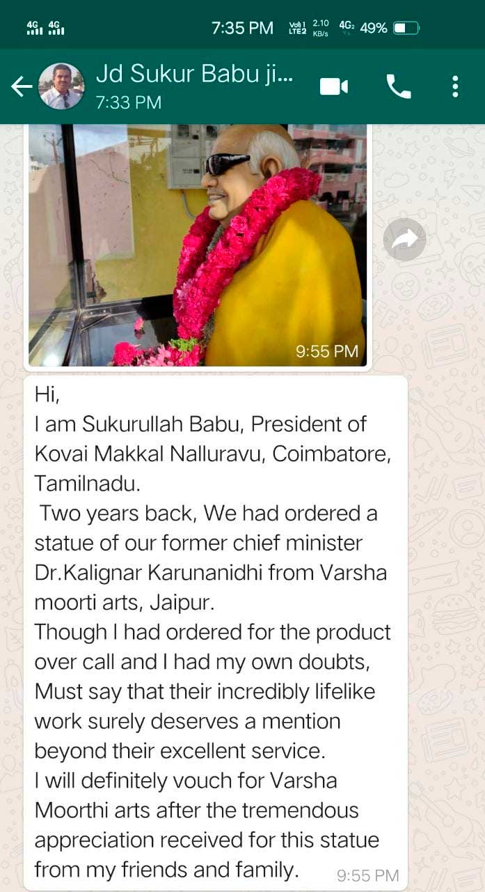 “Hi, I am Sukurullah Babu, President of Kovai Makkal Nalluravu, Coimbatore, Tamilnadu. Two years back, We had ordered a statue of our former chief minister Dr.Kalignar Karunanidhi from Mahalaxmi Matel Storage, Jaipur. Though I had ordered for the product over call and I had my own doubts, Must say that their incredibly lifelike work surely deserves a mention beyond their excellent service. I will definitely vouch for Varsha Moorthi arts after the tremendous appreciation received for this statue from my friends and family.”