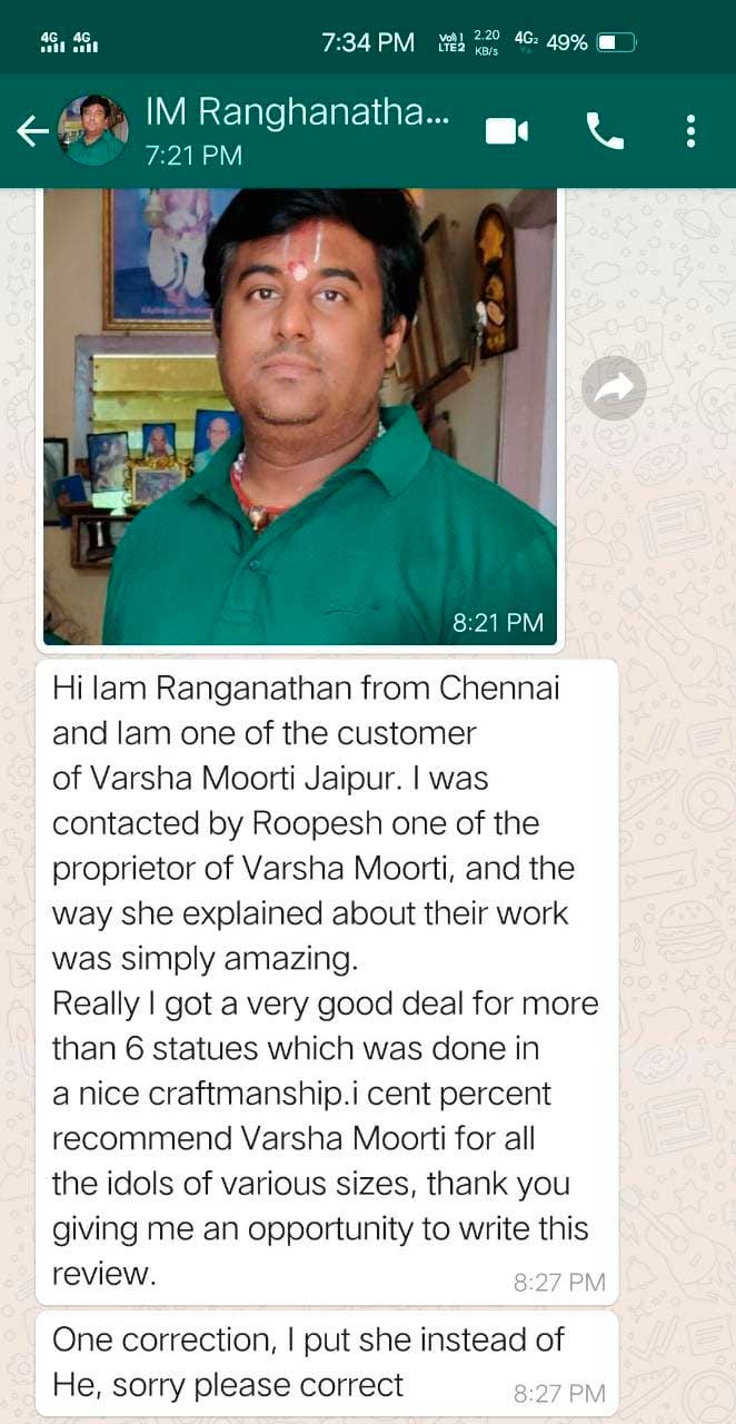 Hi Iam Ranganathan from Chennai and Iam one of the customer of Varsha Moorti Jaipur. I was contacted by Roopesh one of the proprietor of Varsha Moorti, and the way she explained about their work was simply amazing. Really I got a very good deal for more than 6 statues which was done in a nice craftmanship.i cent percent recommend Varsha Moorti for all the idols of various sizes, thank you giving me an opportunity to write this review.